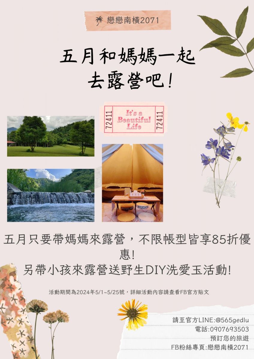 溫馨五月,是屬於母親們的節日!戀戀南橫2071露營區於5月1日至5月26日期間,推出母親節限定活動,用最貼心的優惠與體驗,報答母親對家庭的無私付出。